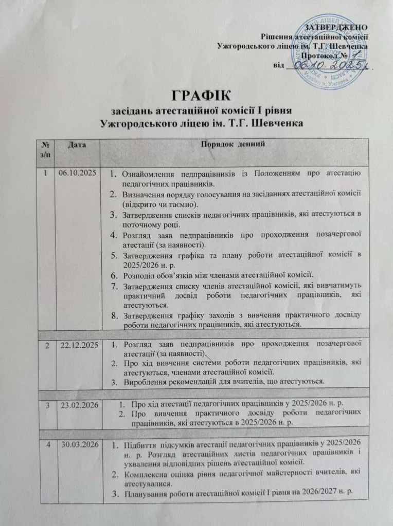 ГРАФІК підвищення кваліфікації педагогічних та науково-педагогічних працівників Ужгородського ліцею ім. Т. Г. Шевченка на 2025 рік: