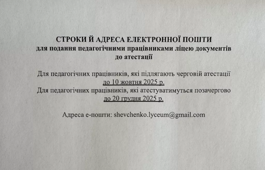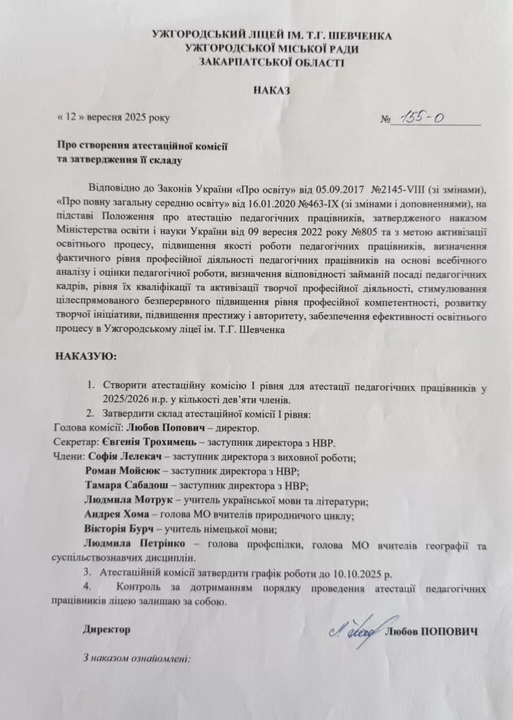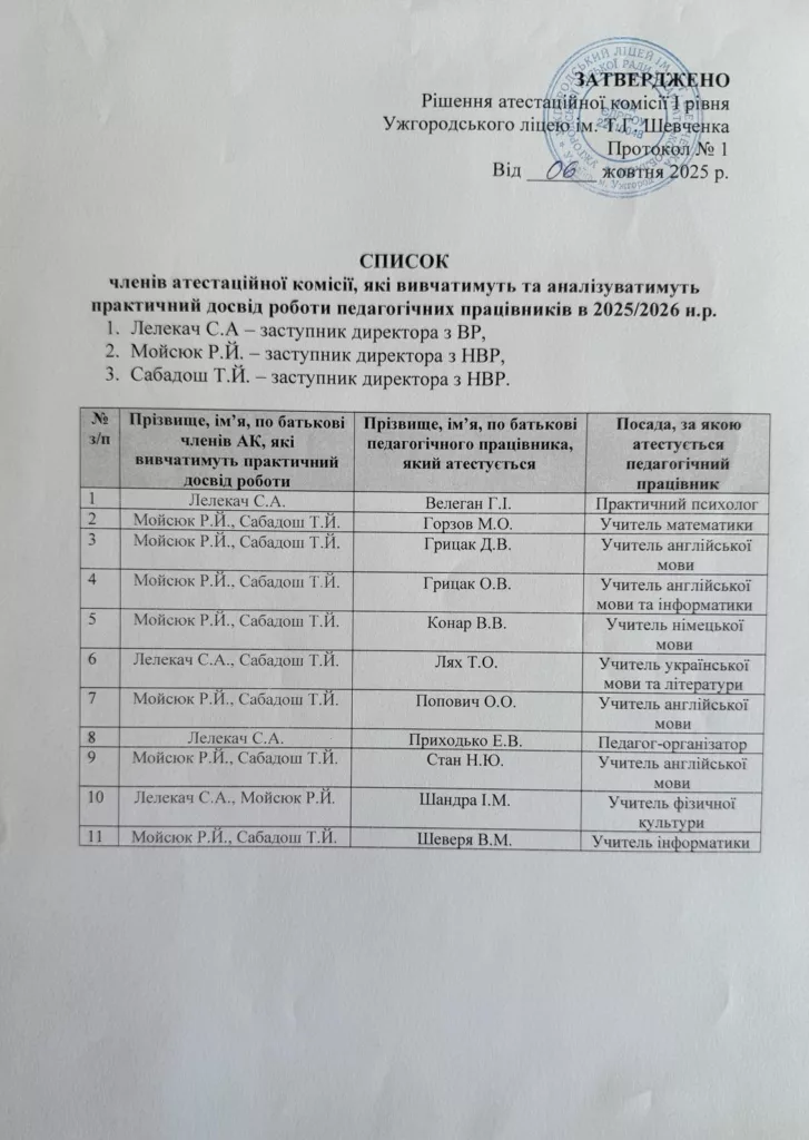Список педагогічних працівників Ужгородського ліцею ім. Т.Г. Шевченка, які підлягають черговій атестації в 2024/2025 навчальному році
