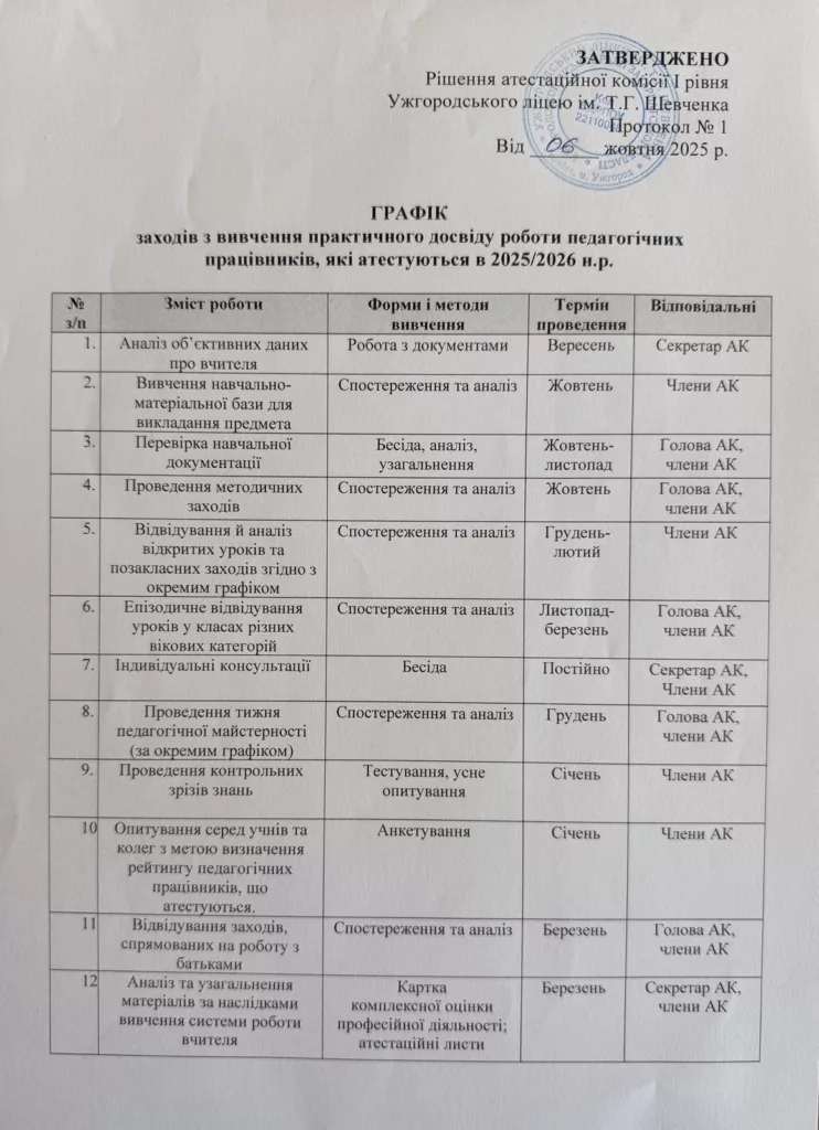 Графік заходів з вивчення практичного досвіду роботи педагогічних працівників, які підлягають черговій атестації в 2024/2025 н.р.