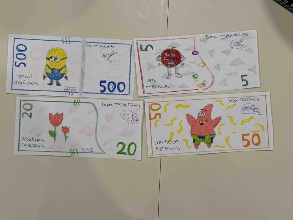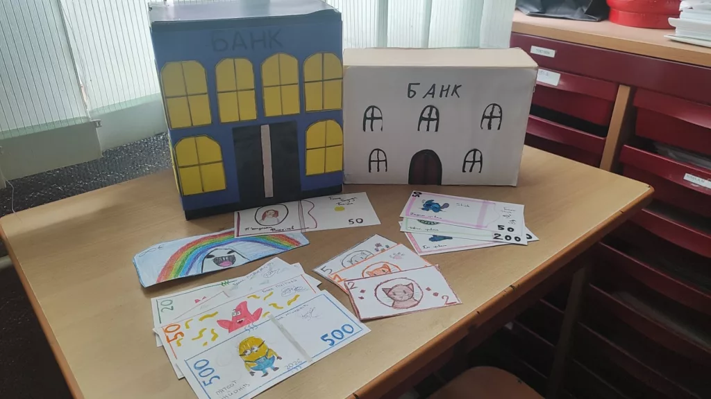 Учні 4(8)-В, Г, Д класів у межах проєктної роботи створювали моделі банків та розробляли власні дизайни грошових купюр, поєднуючи творчість із розумінням ролі грошей у суспільстві.