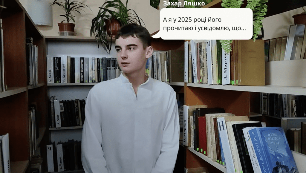 Для участі в конкурсі Захар підготував атмосферну відеороботу: у стінах бібліотеки він читає лист Бориса Грінченка до Гадяцького Миколи та Осауленка Свирида, знайомлячи глядачів із думками та творчим стилем видатного українського письменника та громадського діяча.