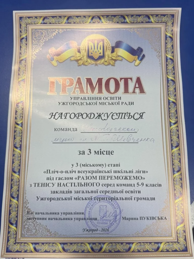 Щиро вітаємо команду Ужгородського ліцею ім. Т. Г. Шевченка з почесним ІІІ місцем у ІІІ (міському) етапі Всеукраїнських шкільних ліг «Пліч-о-пліч» під гаслом «Разом переможемо» з настільного тенісу серед учнів 5–9 класів закладів загальної середньої освіти Ужгородської міської територіальної громади!