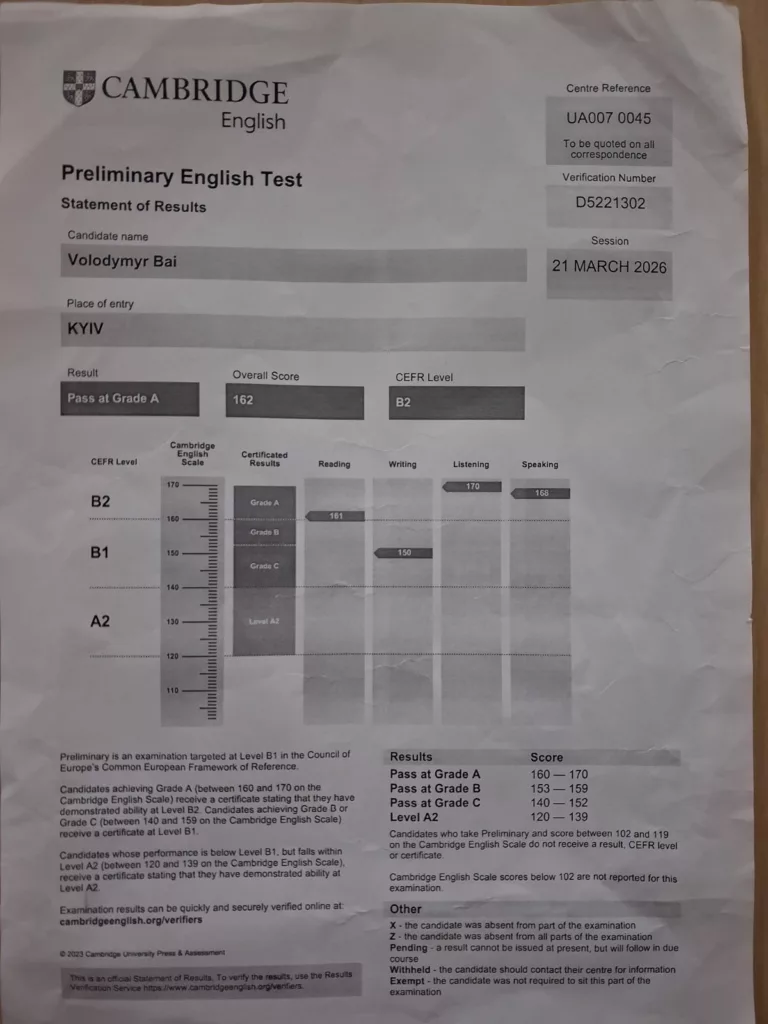 Учень 3(7)-Г класу нашого ліцею Володимир Бай продемонстрував відмінний рівень знань англійської мови, успішно склавши Кембриджський іспит рівня B1 на найвищу оцінку — A.