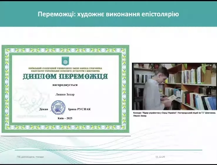 Учень 7(11)-В класу Захар Ляшко здобув перемогу у номінації «Художній виклад епістолярію» на Всеукраїнському конкурсі відеоробіт «Лідер українства: всесвітнє значення Бориса Грінченка», присвяченому життю та діяльності Бориса Грінченка та його родини, який проводить Київський столичний університет імені Бориса Грінченка.